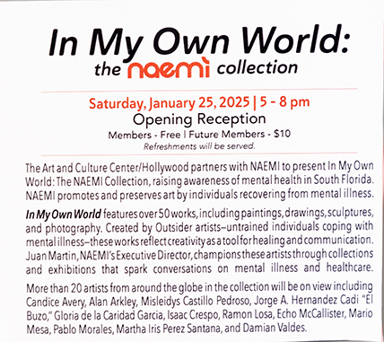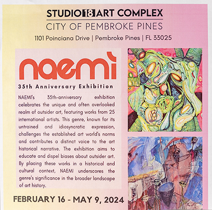 NAEMI is a not for profit organization based in the United States, founded in 1988. NAEMI’s main goal is to discover, study, promote, exhibit and preserve the art of people recovering from mental illnesses. Since its inception, NAEMI has developed numerous projects. In addition to annual exhibitions in South Florida, the collection has traveled to numerous museums and galleries in the United States, Spain, Cuba, Belgium, Chile, Argentina, Peru, Paraguay, Bolivia and Mexico. We welcome all contributions and donations. If you would like to donate to NAEMI via PayPal, please click the button below.