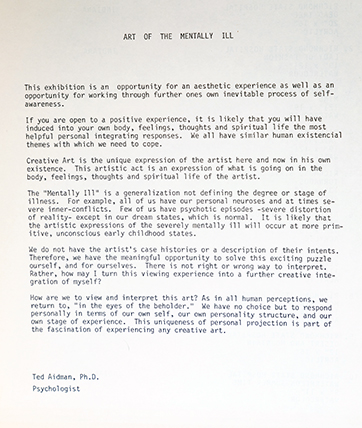 Our mission at NAEMI is to promote the artistic works of outsider artists, and reduce the stigma associated with mental illnesses by discovering, studying, promoting, exhibiting and preserving works of artistic excellence created by artists recovering from mental illnesses worldwide.