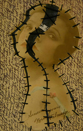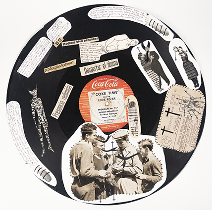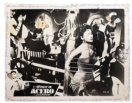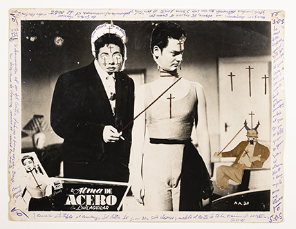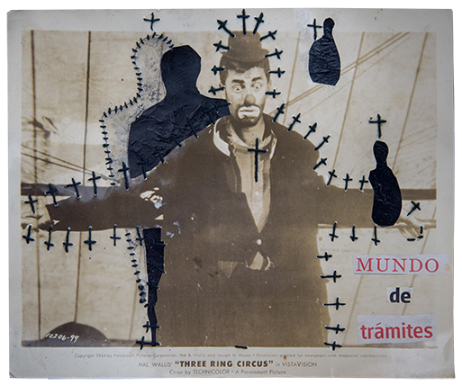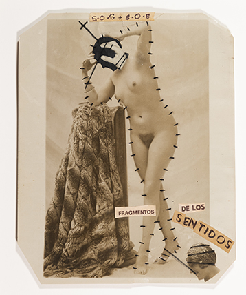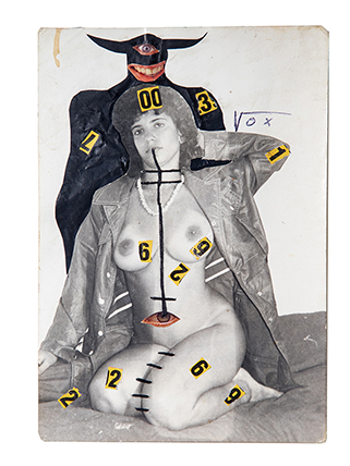 He utilizes recycled materials such as brass and wood boxes on whose exterior and interior sides he adds black and white photographs. To do this he trims and draws with a blue pen content of a sexual and diabolical nature.